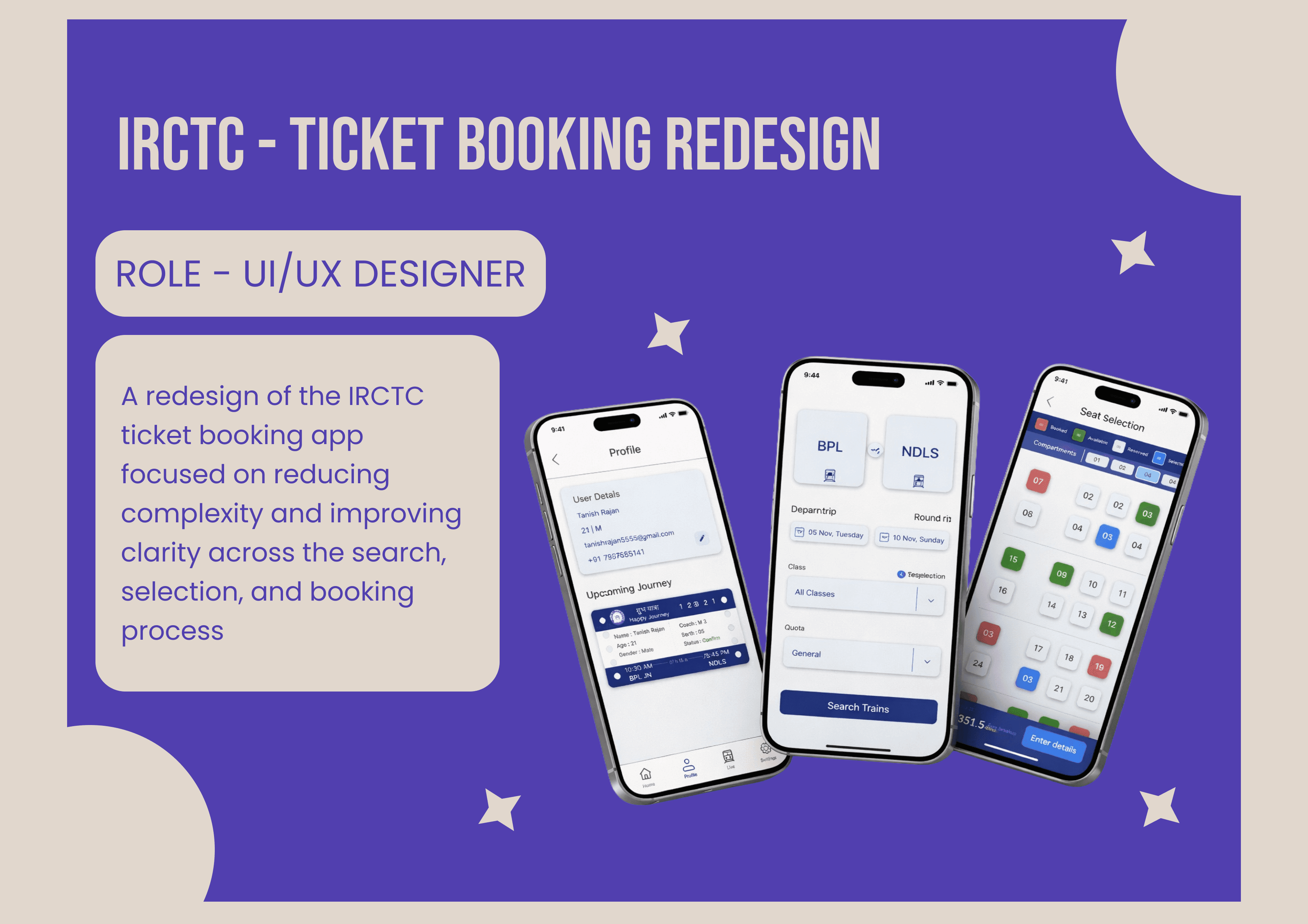 A UX redesign of the IRCTC ticket booking experience focused on reducing friction and simplifying complex user flows.