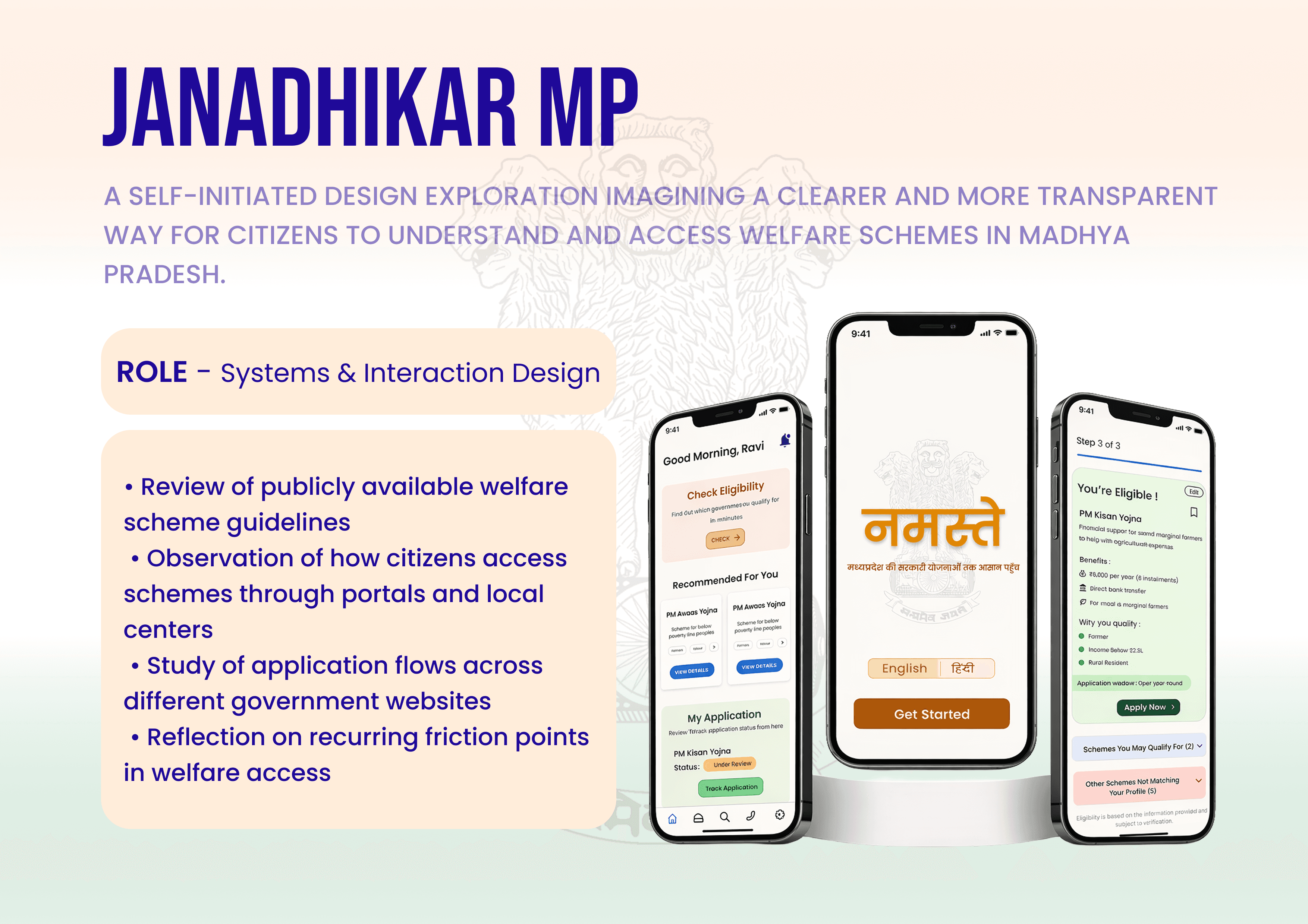 Through research and user journey mapping, the goal became clear: simplify discovery, reduce friction, and create a structured pathway from awareness to application. Janadhikar MP transforms a traditionally complex process into a guided digital experience where users can check eligibility, understand documentation needs, and apply seamlessly.